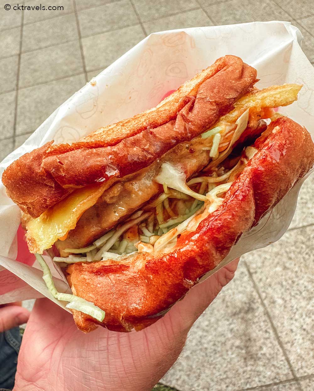 Their classic sandwich consists of ham, cheese, egg, pickle and diced cabbage covered in swathes of sauce, covered in toasted butter sweet bread.