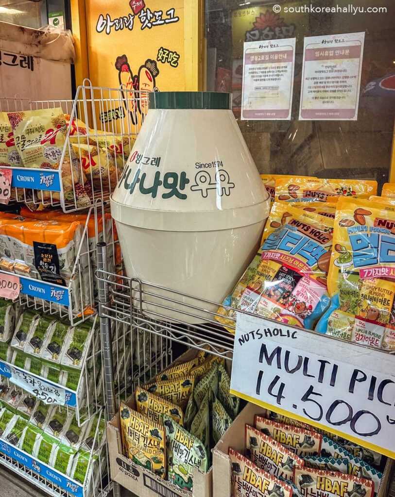 It is also often cheaper to buy banana milk than it is to say buy a can of Coca Cola or other soft drinks – Korean Banana Milk is pretty much available in every store we went to so it is easy to buy (although many times we saw it had sold out).