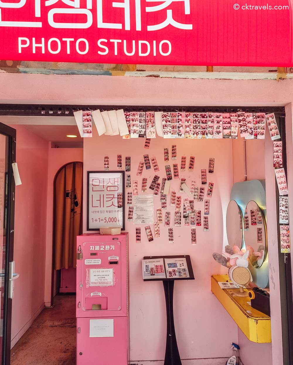 One of the most fun things to do in Gamcheon Cultural Village, there are a couple of Korean photo booth kiosks dotted around including a branch of Photostudio.