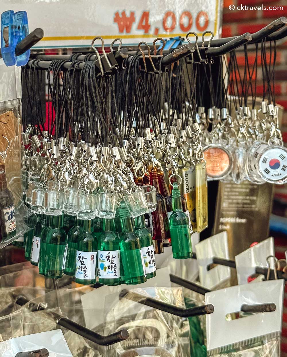 Prices of the pin badges are cheap and you can also get things like Coca-Cola bottle earrings or South Korean beer bottle keyrings.