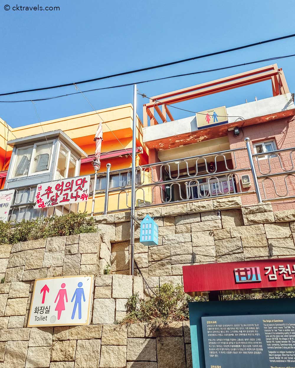 - There are at least two free toilet blocks in Gamcheon Cultural Village. The first is when you first enter near the Little Museum and Tourist Information. A smaller set of Gamcheon public toilets can also be found near the BTS mural.